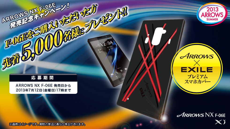 なお、発売日から7月12日までの購入者のうち先着5000名で、ARROWS NX F-06E用の「EXILEスマホカバー」がもらえるようです。
