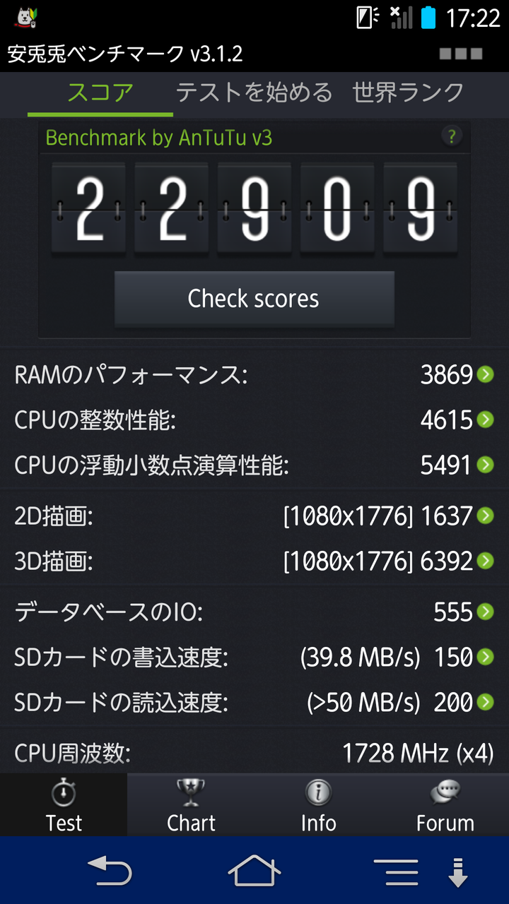 Antutuベンチマークスコアは22909。前機種ARROWS A 201F含む2013年春までのハイスペックモデルは20000前後でしたので、15%程度の性能アップです。