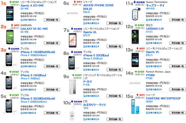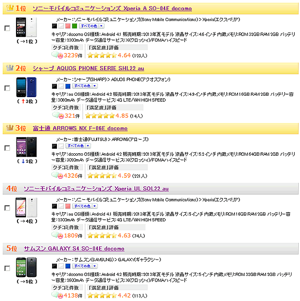 1位:Xperia A SO-04E赤文字が最新の2013年夏モデルです。上位3機種に変化はありません。前回はトップ10圏外だったNECの「MEDIAS X N-06E」が6位まで浮上しました。