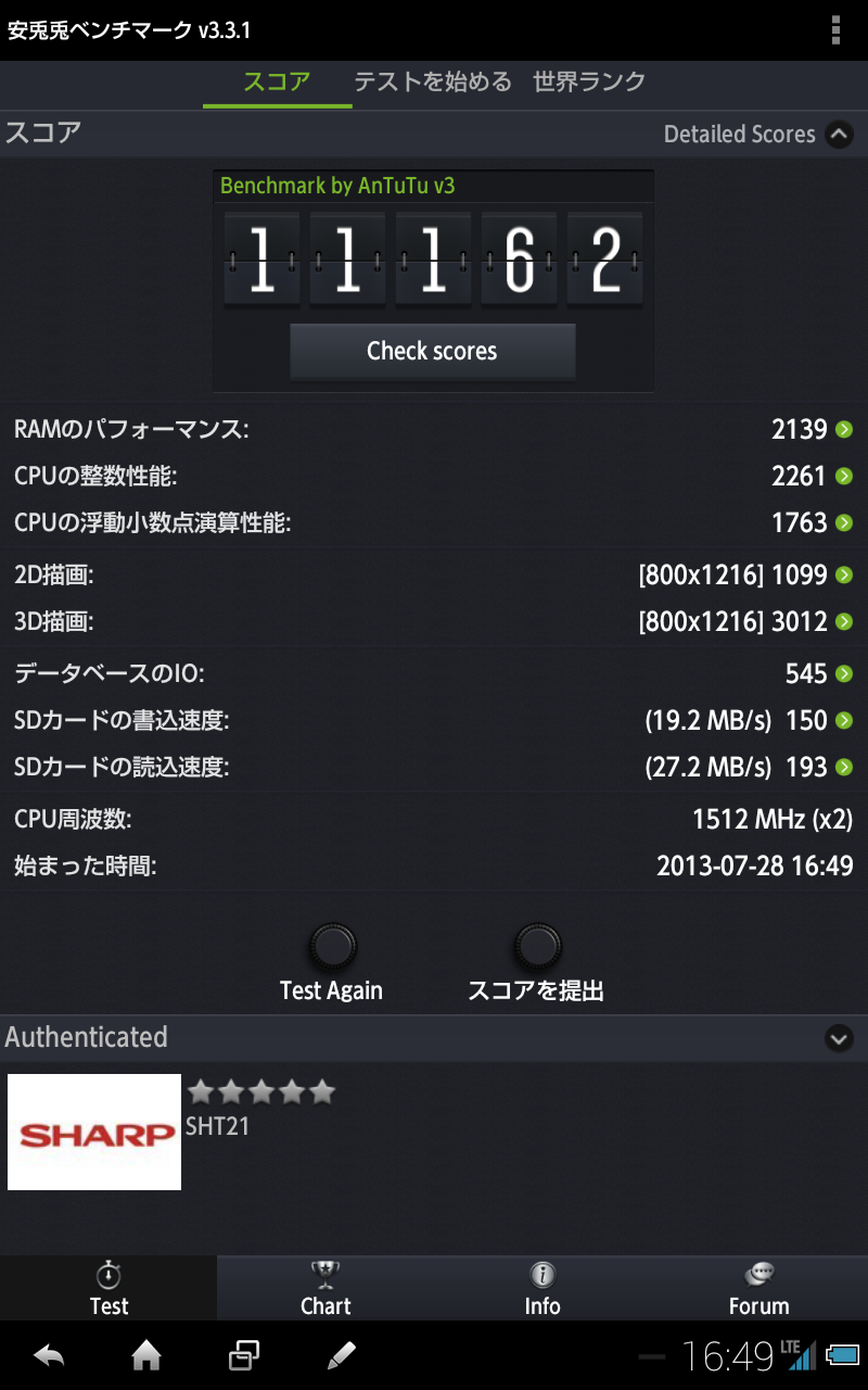 ベンチマークスコアは11162。ドコモのAQUOS PAD SH-08EはクアッドコアCPU搭載ですのでスコアの差は10000近くになります。