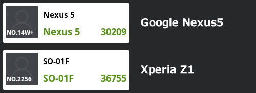 ほぼ同等のスペックを持つ両機種ですが、プラットフォームがAndroid4.4(NEXUS5)とAndroid4.2(Xperia Z1)で大きく異なるため、結果も違いが見られます。