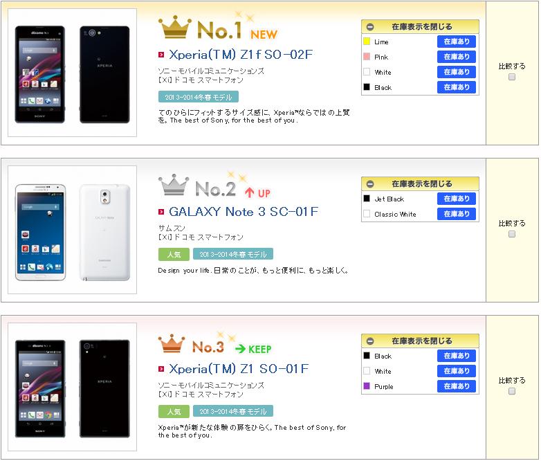 「Xperia Z1 f SO-02F」が順当に1位となりました。