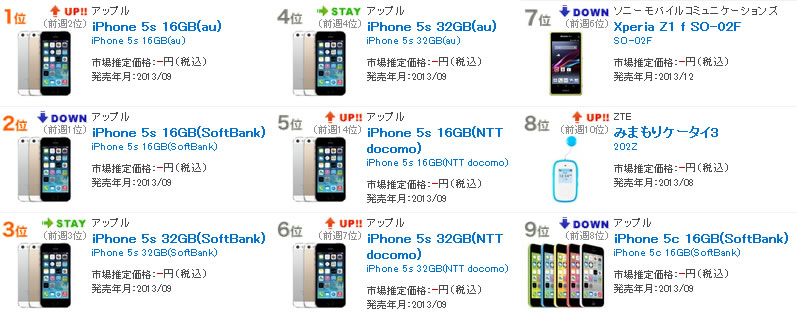 今回はau版の「iPhone5s 16GB」が1位となりました。各キャリアのiPhone5s 16GBと32GBが1~6位を独占している一方、高価な64GBモデルはソフトバンク版の16位が最高となっています。