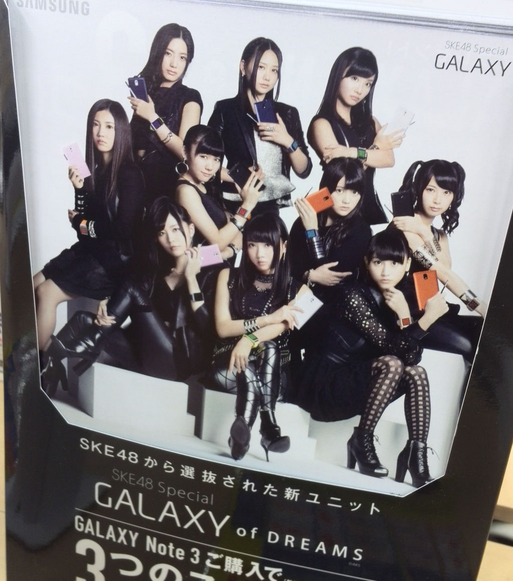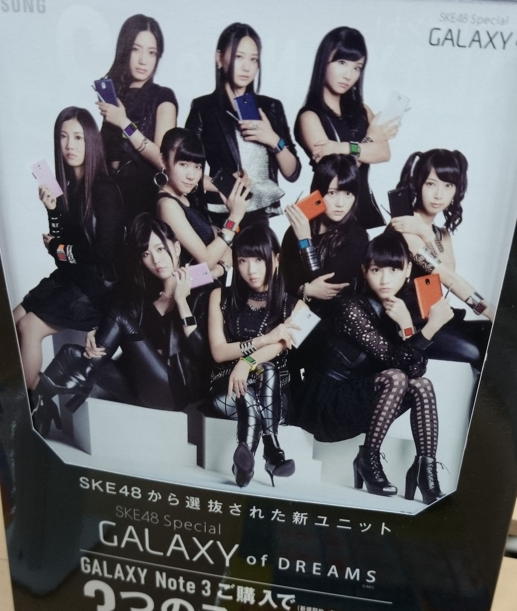 ※ 写真はSKE48とGALAXYのコラボ企画のパンフレット。GALAXY購入者は2ショット撮影会等の権利が得られるそうです。愛と財力が試されますね。