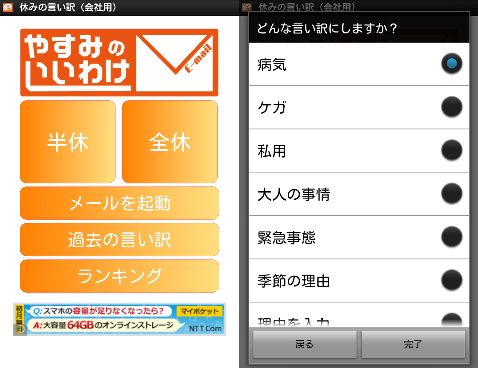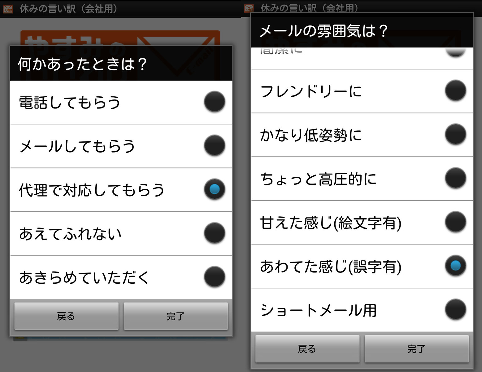 急用で当日欠勤したい場合から仮病でずる休みしたい時まで、会社に送る言い訳メールを作文してくれる便利なアプリです。