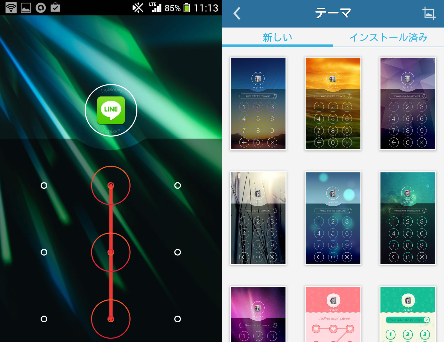 アプリや機能ごとに使用制限をかけられるので、人にスマートフォンを貸す場合や盗み見防止に活躍します。パスワード又はパターンでのロック解除が可能で、ロック解除画面の背景画像も好きに設定可能。
