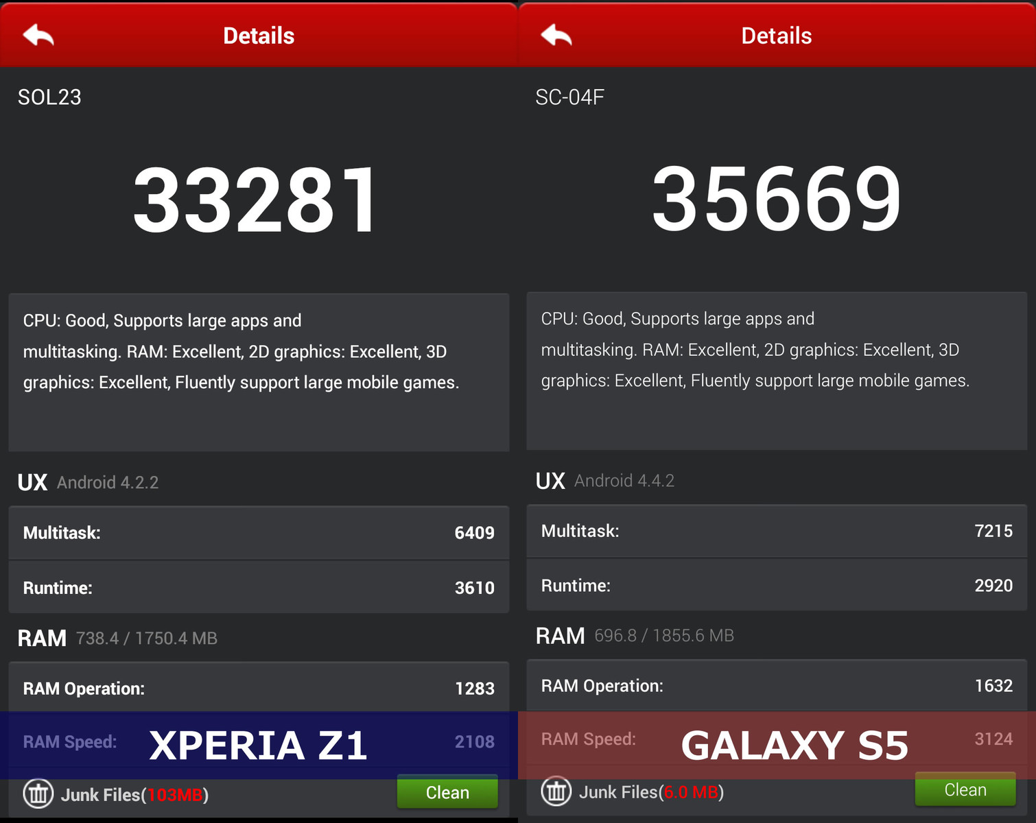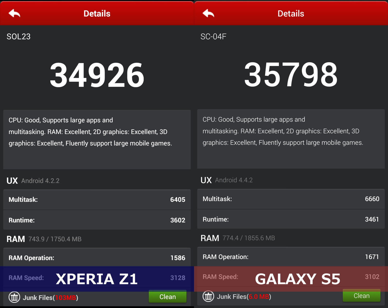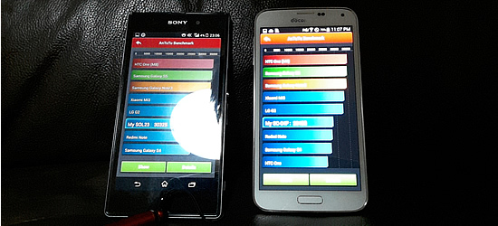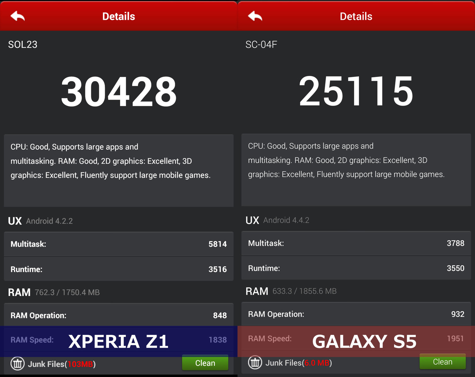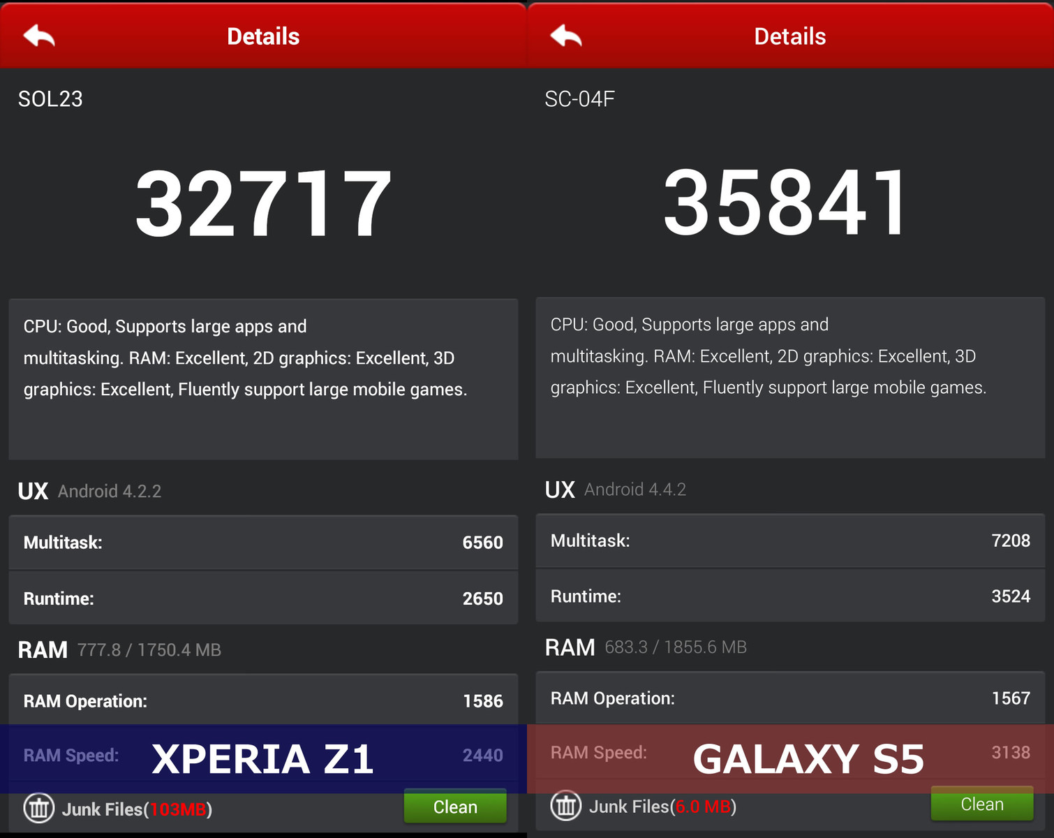 RAMや画面解像度は同じで、CPUクロックはXperia Z1が2.2GHz&GALAXY S5が2.5GHz。