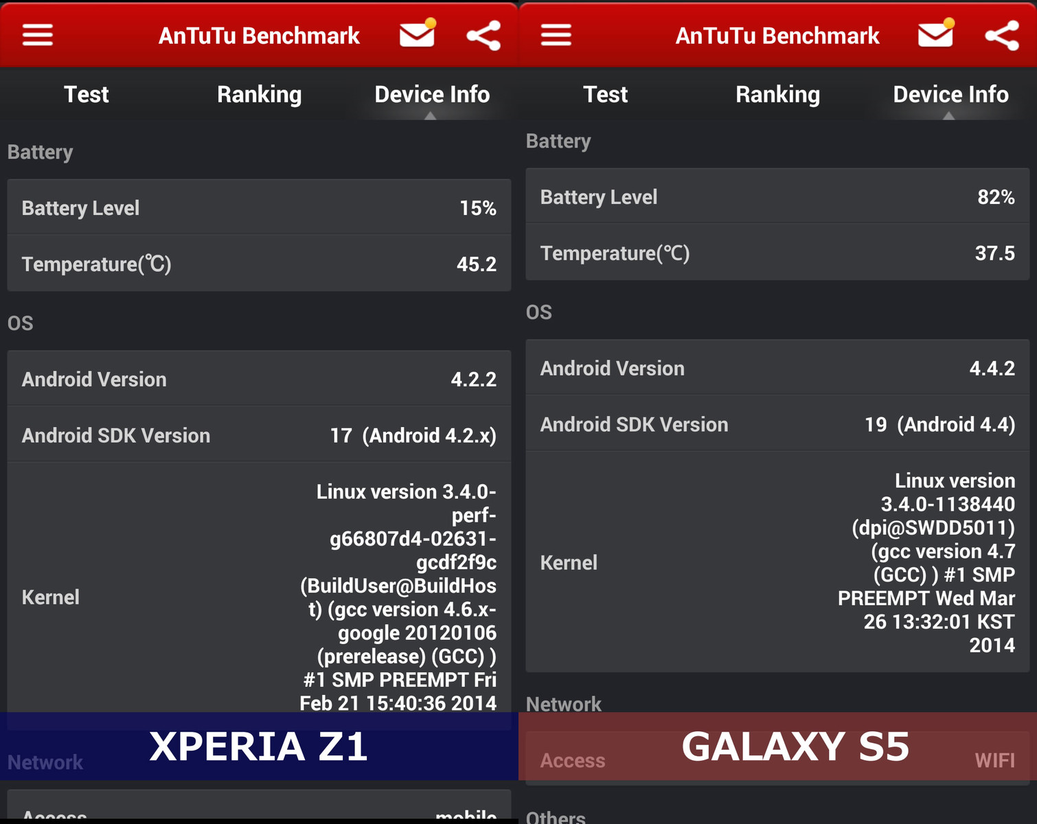 検証には、お馴染みのベンチマークアプリ「Antutuベンチマーク(Ver. 4.4.2)」を使用します。比較用のXperia Z1と同時に繰り返し実施し、ベンチマーク一回毎にスコア・バッテリー温度・本体表面温度を確認します。