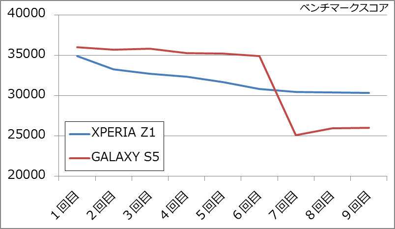 ここでGALAXY S5が一気に10000近くスコアを落としました。ようやくパフォーマンス制限が働きだしたようです。