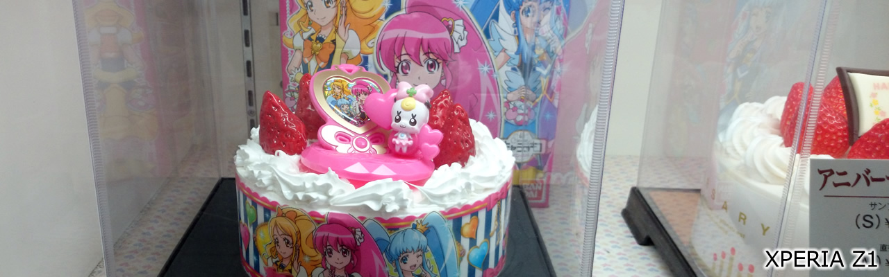 ブログテーマ「おいしい」向けケーキ写真。最近はプリキュアのケーキが人気のようです。よく見ると、普通のイチゴケーキをベースに、普通は透明の周辺フィルムに印刷&上におもちゃ乗せただけなんですね。