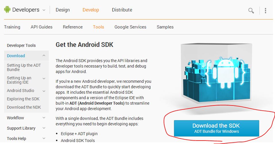 http://developer.android.com/sdk/にアクセスし、「Download the SDK」をクリック。利用中のWindows環境に合わせて、32bit / 64bitを選択しダウンロード。