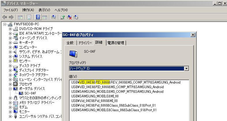 スマートフォンとPCをUSB接続。デバイスマネージャでスマートフォンのVIDとPIDを確認したら、スマートフォンをドライバごとデバマネから削除し取り外す。