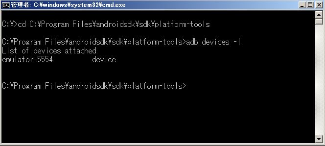 cd C:\Program Files\androidsdk\sdk\platform-tools一応、スマートフォンが正常に認識されているか確認。