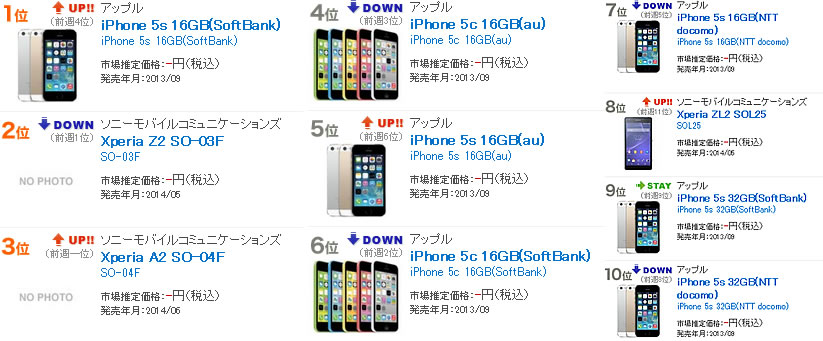 2014年夏モデルスマートフォン全体の順位は下記のとおりです。