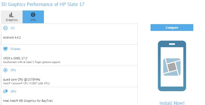 幅広いプラットフォーム向けに提供されているベンチマークソフト「GFXbench」の測定結果に、hp製の未発表端末「hp Slate 17」が登場しました。