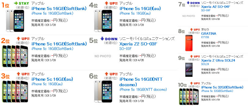BCNの携帯電話週間ランキングは、ソフトバンクのiPhone5sが先週に続いて1位でした。