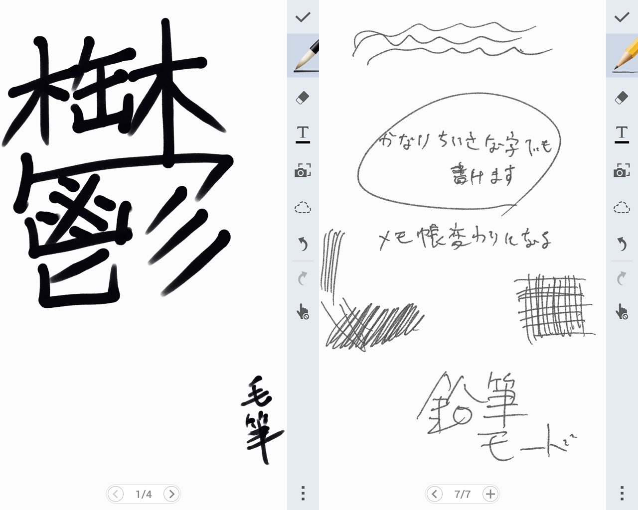 速度・圧力・傾き・回転の感度は、GALAXY Note 3比で約2倍に進化したそうです。標準アプリの「Sノート」を使って色々なペンでの手書きを試してみました。