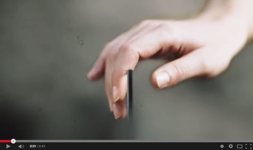 冒頭に登場する新製品らしき端末の側面。Xperia Z3等のスマートフォンに比べると異様に薄い形状であり、タブレット(ファブレット)と予想できます。
