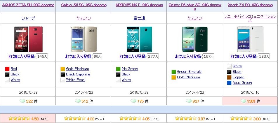 抽出条件:ドコモ2015年夏モデルで、レビューが10件以上の機種