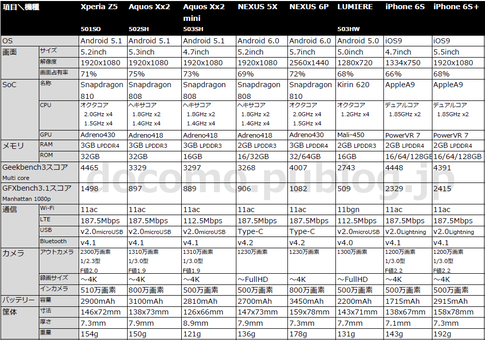 関連) ドコモ2015年冬モデルのスペック比較