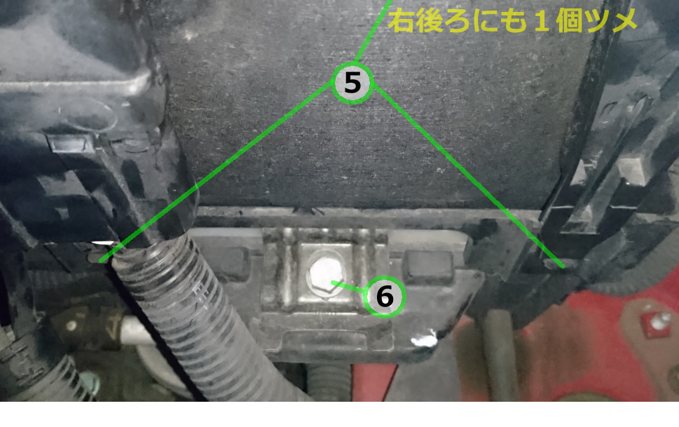 ⑤バッテリーを覆っているカバーを外します。前面左右に2個・右奥に1個の、計3個のツメで固定されてます。手が入りにくく力をかけにくい右奥ツメは、紐などをツメにかけて引き上げると外しやすいです。