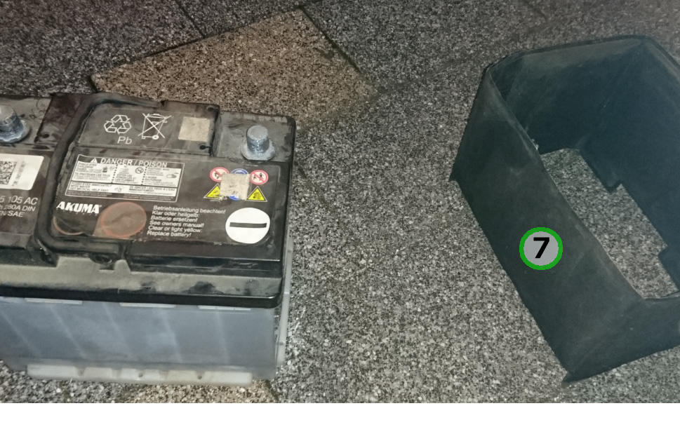 バッテリーを取り出し、⑦保護(耐震?)クッションを外します。あとは新品バッテリーを、取り外しと逆の⑦~②の順で取り付けます。