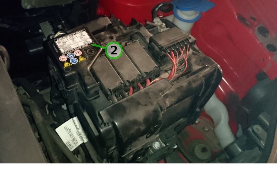 エンジンルームのバッテリー周辺。②のカバーを開けます。