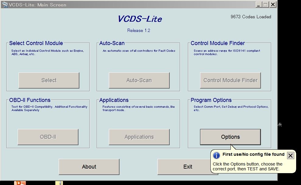 VCDS-Liteを起動。まずは初期設定のために「Option」ボタンを押します。