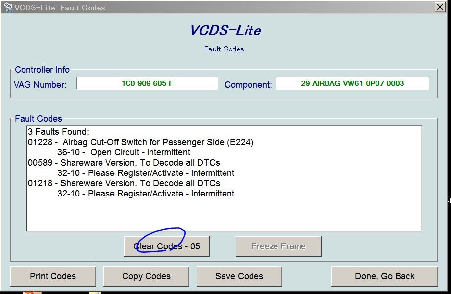 エラー履歴の一覧が表示されます。「01228 - Airbag Cut-Off Switch for Passenger Side (E224)」が警告灯の原因のようです。
