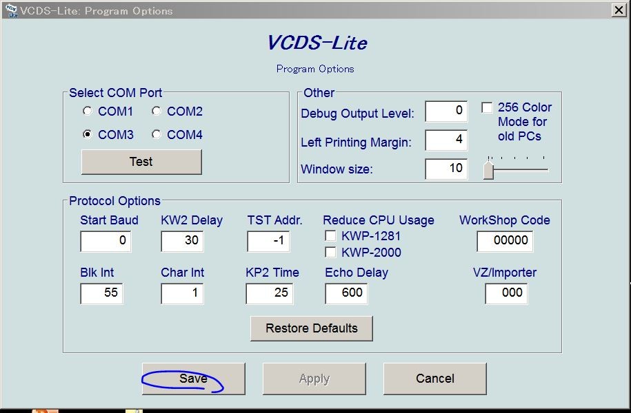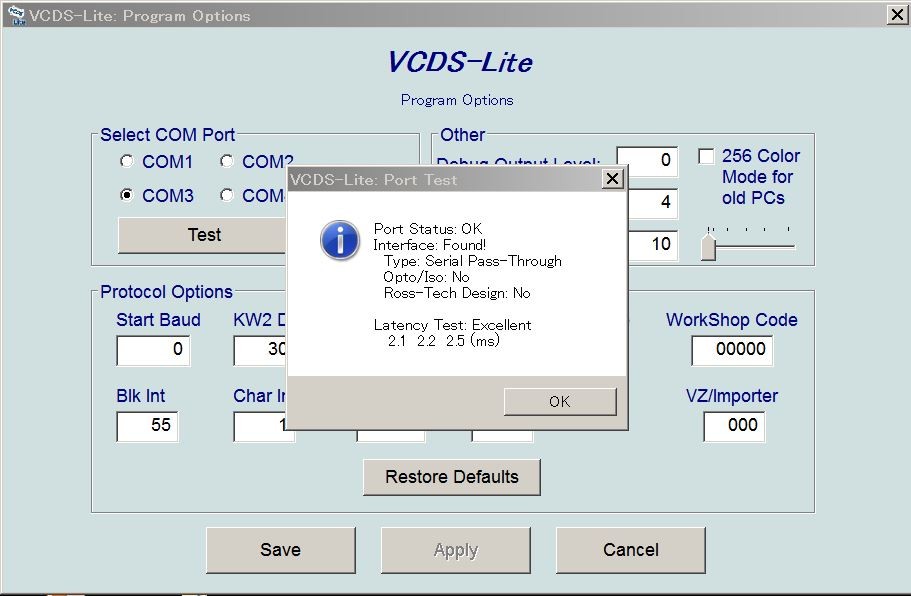 先ほどデバイスマネージャで確認したCOMポート番号(今回はCOM3)を選択します。Testを押すと接続確認が行われるのですが、まだワーゲンと接続してないのでエラーが出ます。